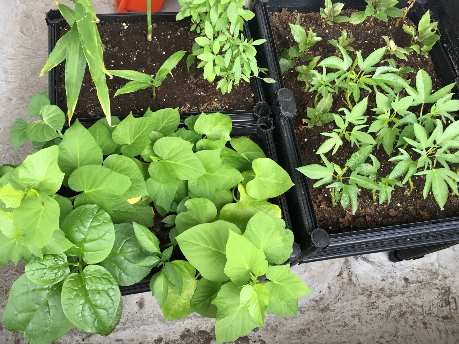 地瓜葉、落葵、薑、九層塔、紅鳳菜。